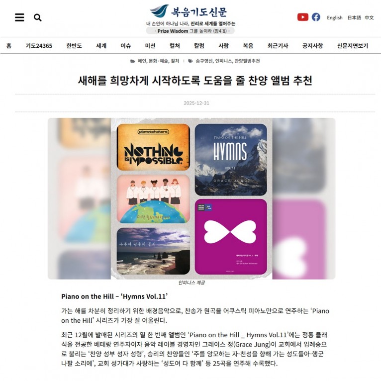 최근 12월에 발매된 시리즈의 열 한 번째 앨범인 ‘Piano on the Hill _ Hymns Vol.11’에는 정통 클래식을 전공한 베테랑 연주자이자 음악 레이블 경영자인 그레이스 정(Grace Jung)이 교회에서 입례송으로 불리는 ‘찬양 성부 성자 성령’, 승리의 찬양들인 ‘주를 앙모하는 자-천성을 향해 가는 성도들아-행군 나팔 소리에’, 교회 성가대가 사랑하는 ‘성도여 다 함께’ 등 25곡을 연주해 수록했다.