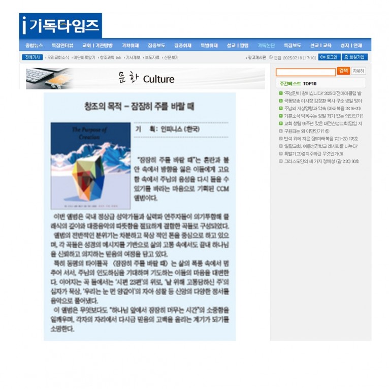 뮤직타임 [기사] 창조의 목적 - 잠잠히 주를 바랄 때(기독타임즈)