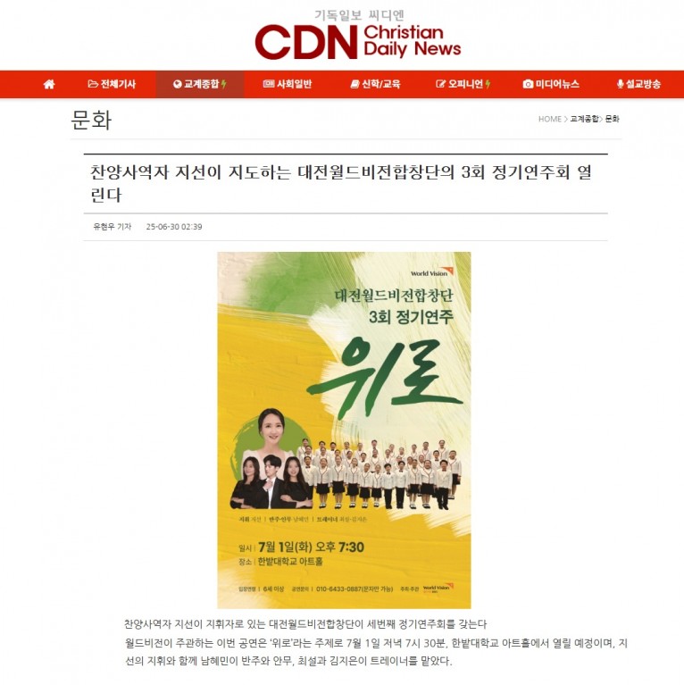 뮤직타임 [기사] 찬양사역자 지선이 지도하는 대전월드비전합창단의 3회 정기연주회 열린다(기독일보 씨디엔)