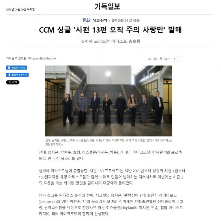 앞서 ‘시편 150 프로젝트’는 지난 2023년 6월 공개된 시편 1편 ‘복 있는 사람’ 헤리티지 매스콰이어를 시작으로 시편 2편 ‘Lord Have Mercy On Me’ 범키, 시편 3편 ‘아침의 노래’ 이승철을 비롯해 류세라, 류지광, 에일리, 박지헌, 김조한, 히스플랜 등 가요계를 대표하는 가수들이 대거 참여했다.