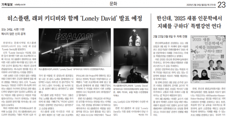 [기사] 그룹 히스플랜(HISPLAN), 새 싱글 ‘Lonely David’ 발표(기독일보)
