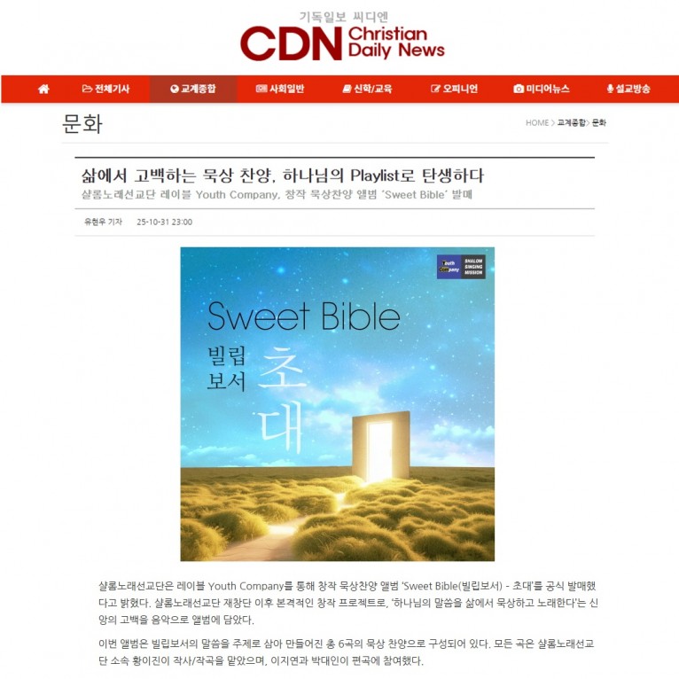 샬롬노래선교단 레이블 Youth Company, 창작 묵상찬양 앨범 ‘Sweet Bible’ 발매
